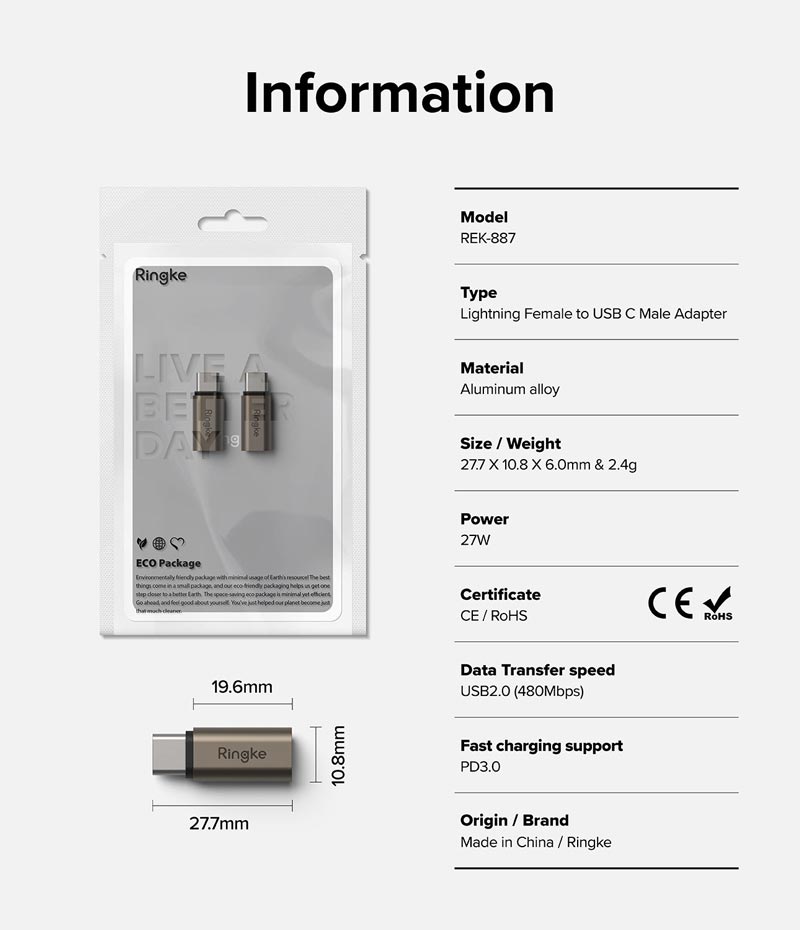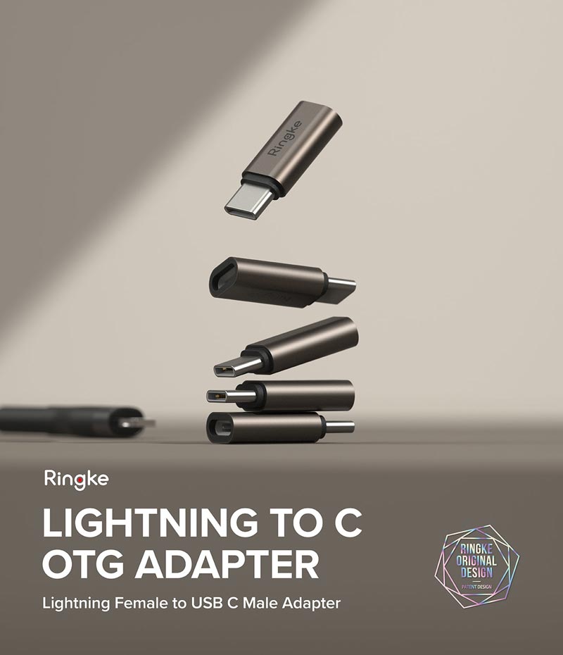 - Đầu chuyển Ringke Lightning to C OTG Adapter được thiết kế nhỏ gọn, màu sắc sang trọng giúp kết nối với bộ sạc thiết bị, sạc xe hơi, máy tính để bàn và laptop nhằm nâng cao sự tiện lợi tối đa trong cuộc sống hàng ngày.