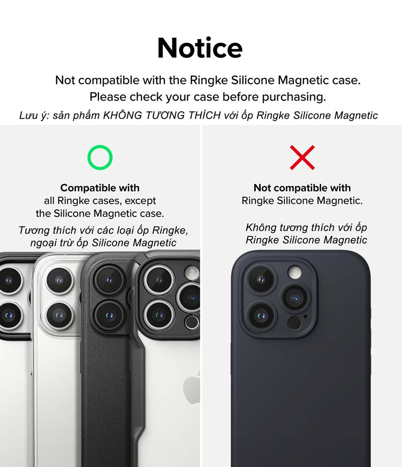 - Tương thích với hầu hết các loại ốp lưng Ringke, ngoại trừ ốp Silicone Magnetic là không tương thích.