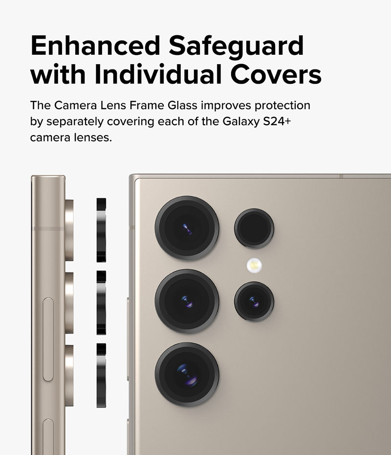 - Dán camera Samsung Galaxy S24 Ultra Ringke Camera Lens Frame Glass gồm 5 lens rời, bảo vệ tốt hơn từng mắt camera