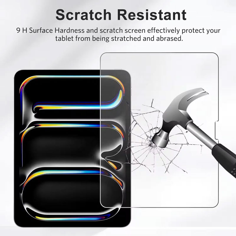 Bảo vệ màn hình bằng kính cường lực 9H cho các mẫu Apple iPad Pro 2025 M5 hoặc iPad Pro 2024 M4 (11-inch) (xem khả năng tương thích bên dưới) có tấm phòng thủ cứng cáp với cạnh hồ quang 2.5D và được sản xuất từ kính trong suốt nhiều lớp cao cấp.