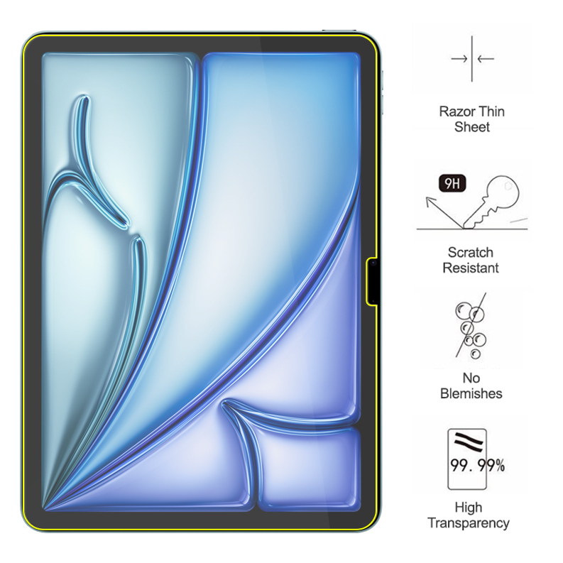 Bảo vệ màn hình bằng kính cường lực 9H cho các mẫu Apple iPad Air M3 (11-inch) (xem khả năng tương thích bên dưới) có tấm phòng thủ cứng cáp với cạnh hồ quang 2.5D và được sản xuất từ kính trong suốt nhiều lớp cao cấp.