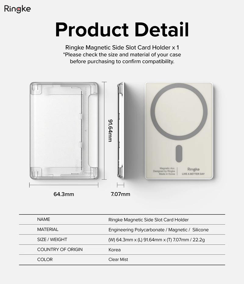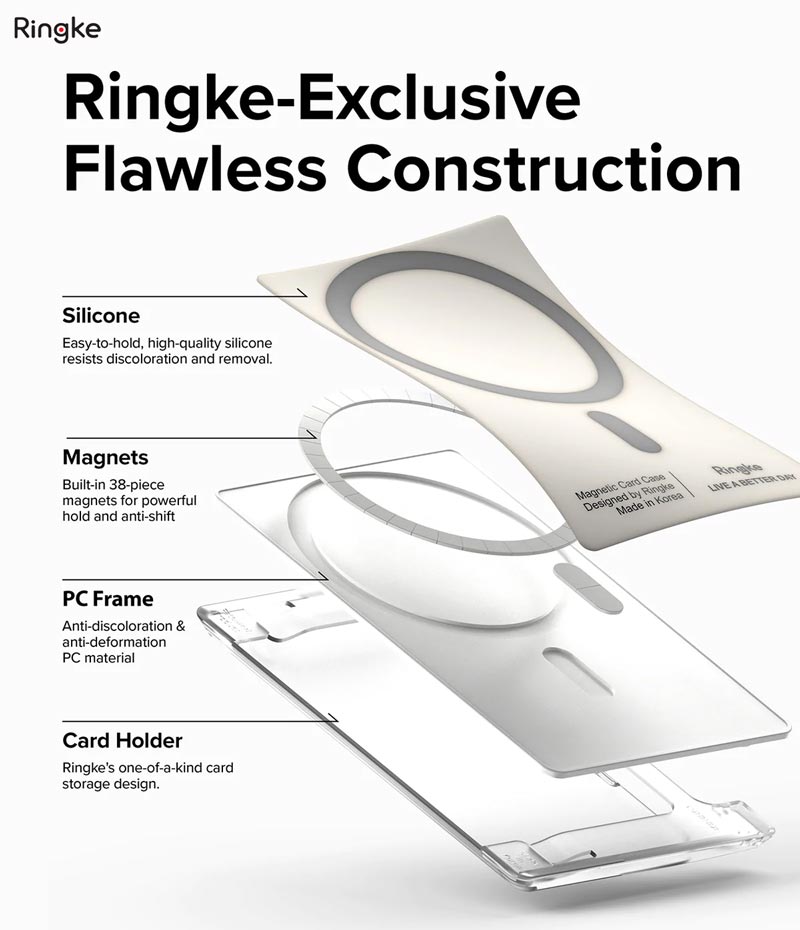 - Nhựa PC cao cấp, có từ tính Magnetic tương thích với công nghệ MagSafe của iPhone, thương hiệu Ringke được sản xuất tại Hàn Quốc