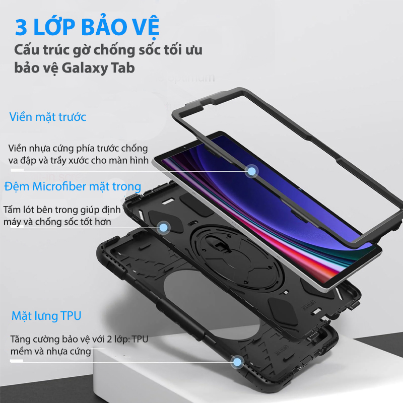 Bảo vệ chắc chắn cho Tab của bạn với cấu trúc 3 trong 1 làm từ nhựa PC và silicone, đem đến khả năng bảo vệ toàn diện cùng chống sốc mạnh mẽ.