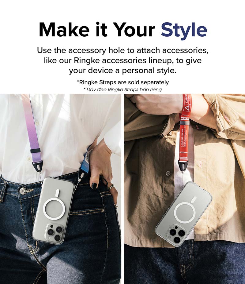 - Có lỗ xỏ dây đeo, bạn có thể mua thêm dây đeo Ringke Strap để tiện dụng hơn (Lưu ý: dây đeo bán riêng, hình ảnh chỉ minh họa cách sử dụng dây đeo)