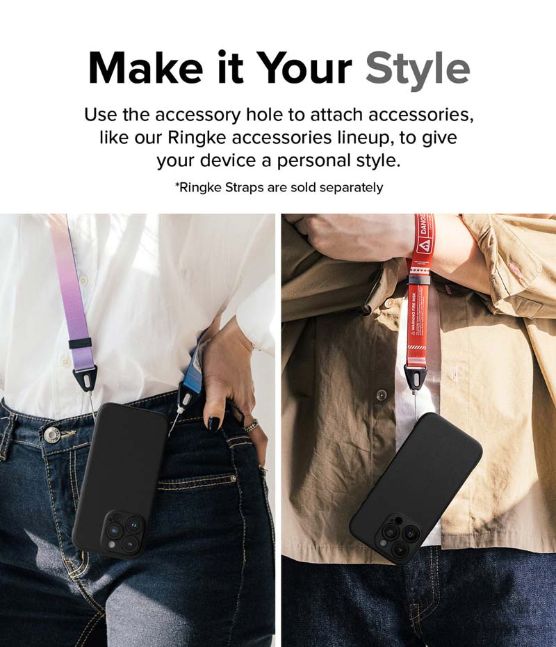 - Có lỗ xỏ dây đeo, bạn có thể mua thêm dây đeo Ringke Strap để tiện dụng hơn (Lưu ý: dây đeo bán riêng, hình ảnh chỉ minh họa cách sử dụng dây đeo)