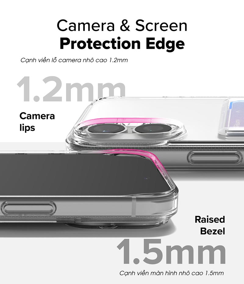 - Thiết kế cạnh viền màn hình nhô cao 1.5 mm và cạnh viền camera nhô cao 1.2 mm giúp chống trầy