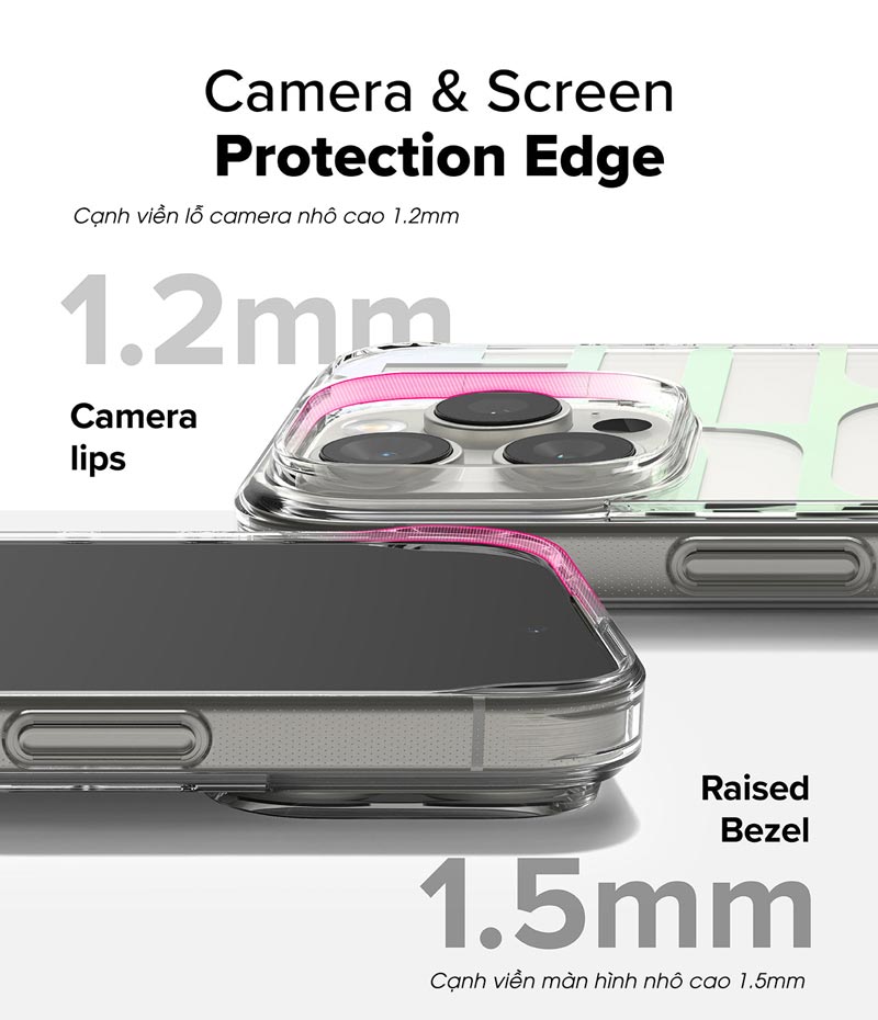 - Thiết kế cạnh viền màn hình nhô cao 1.5 mm và cạnh viền camera nhô cao 1.2 mm giúp chống trầy