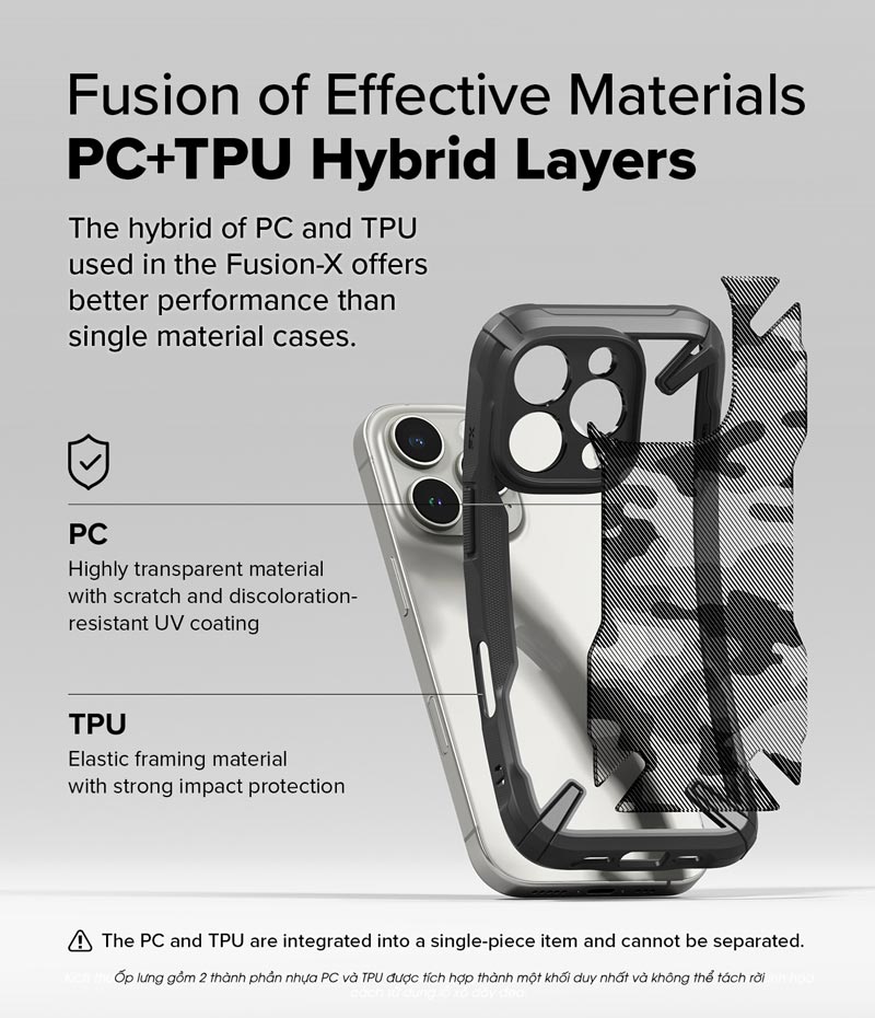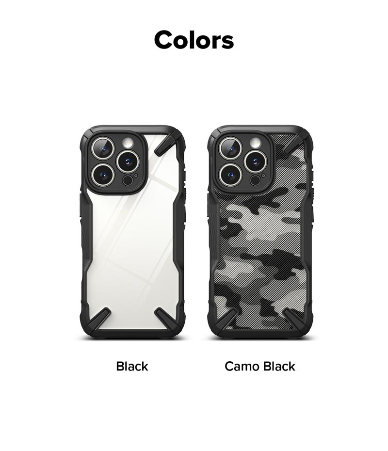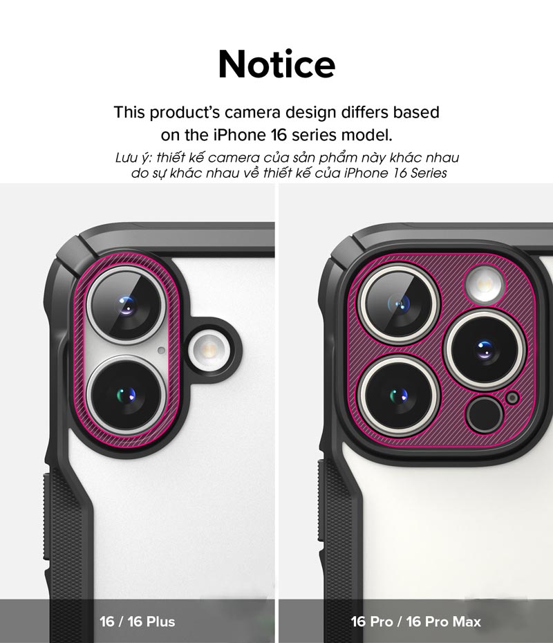 - Do thiết kế phần camera của iPhone 16/16 Plus khác với iPhone 16 Pro/16 Pro Max nên với dòng ốp Fusion X cũng có sự khác nhau ở vị trí camera. Với dòng máy iPhone 16 Pro/16 Pro Max, phần camera được thiết kế cụm nguyên khối, trong khi dòng máy iPhone 16/16 Plus thì phần camera khoét lỗ.
