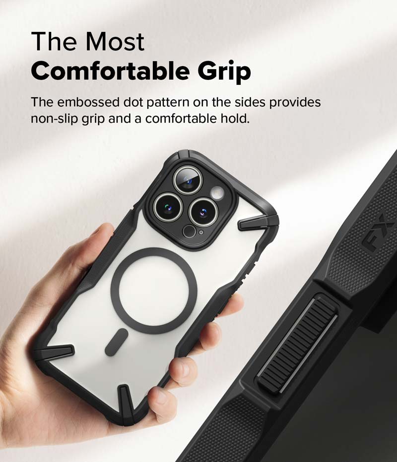 Sản phẩm ốp lưng iPhone 16 Pro Max của Ringke dòng Fusion X Magnetic với thiết kế chống sốc bảo vệ điện thoại của bạn cực tốt, cùng với những gờ nổi ở mặt lưng mang đến cảm giác cầm nắm vô cùng chắc chắn.