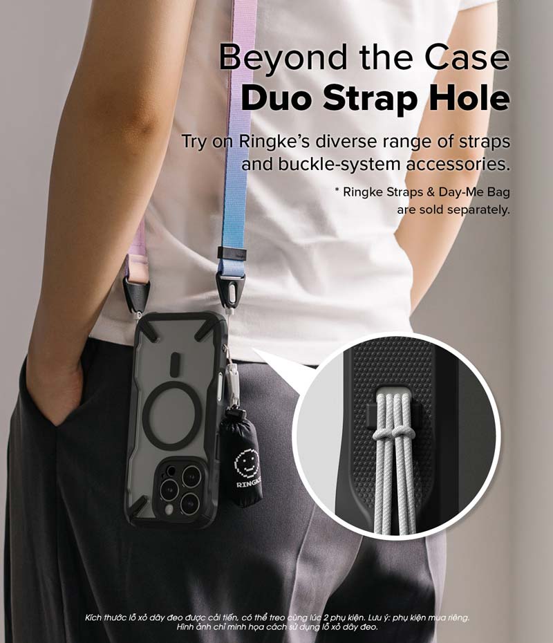 - Kích thước lỗ xỏ dây đeo cải tiến cho phép treo (móc) được 2 phụ kiện cùng lúc. Ngoài ra, dòng Fusion X được thiết kế thêm một lỗ xỏ dây đeo phía trên cùng giúp bạn có thể móc thêm phụ kiện yêu thích. Lưu ý: dây đeo được bán riêng. Hình ảnh chỉ minh họa cách sử dụng sản phẩm.