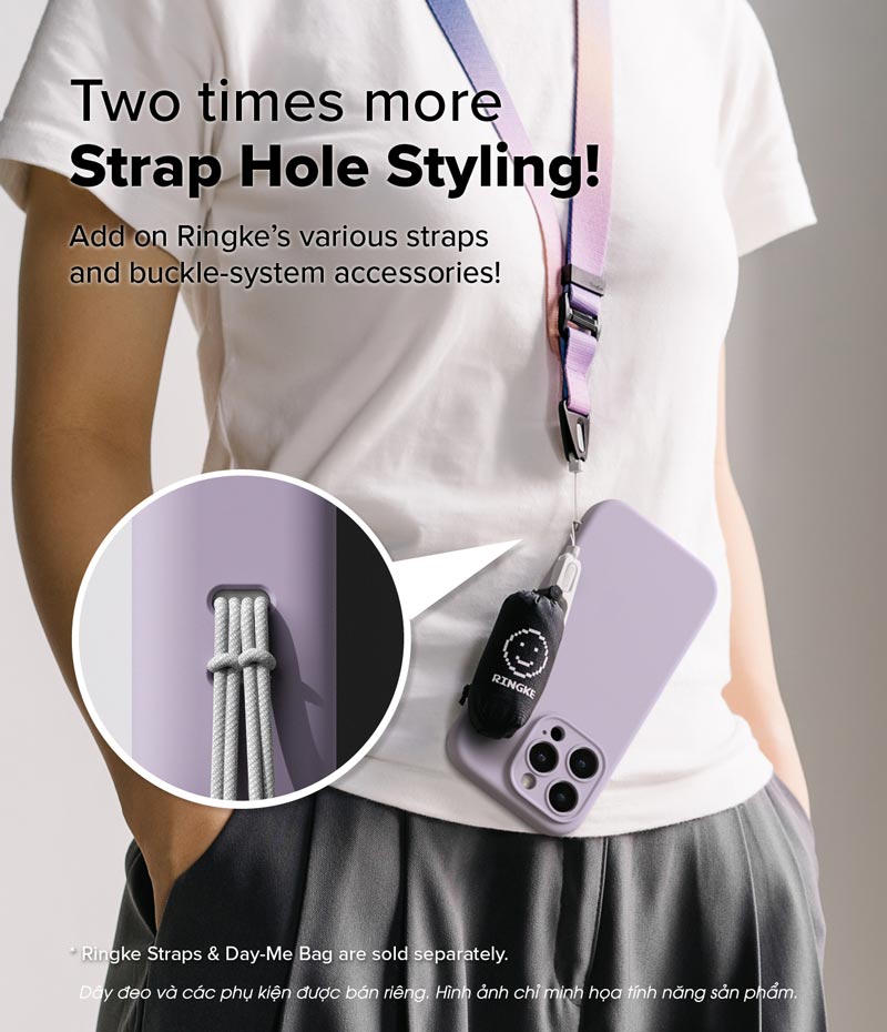 - Thiết kế mới có lỗ xỏ dây đeo, bạn có thể mua thêm dây đeo Ringke Strap để sử dụng điện thoại rảnh tay.