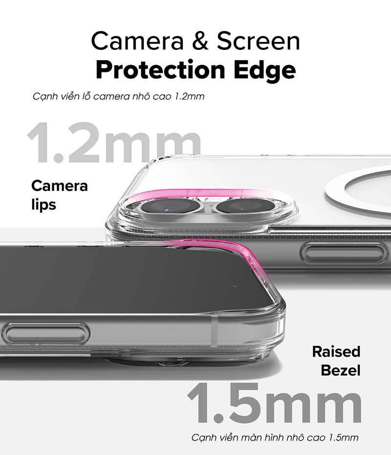 - Thiết kế cạnh viền màn hình nhô cao 1.5 mm và cạnh viền camera nhô cao 1.2 mm giúp chống trầy