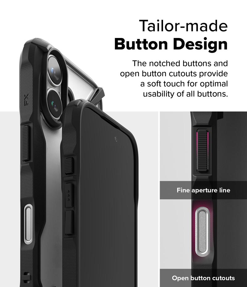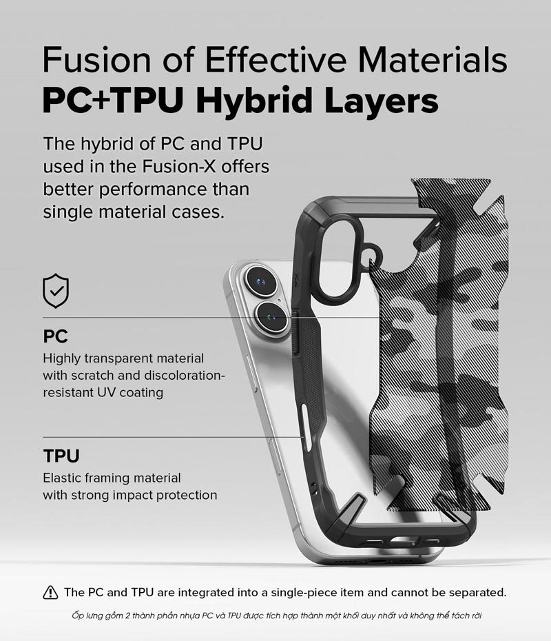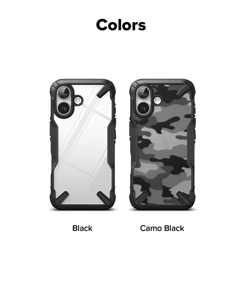 - Do thiết kế phần camera của iPhone 16/16 Plus khác với iPhone 16 Pro/16 Pro Max nên với dòng ốp Fusion X cũng có sự khác nhau ở vị trí camera. Với dòng máy iPhone 16 Pro/16 Pro Max, phần camera được thiết kế cụm nguyên khối, trong khi dòng máy iPhone 16/16 Plus thì phần camera khoét lỗ.