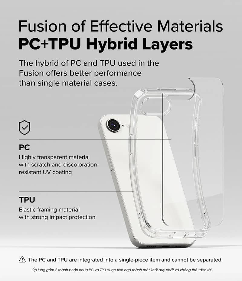 - Ốp được thiết kế 2 thành phần: mặt lưng nhựa cứng Polycarbonate và viền nhựa dẻo TPU giúp dễ dàng tháo lắp ốp
