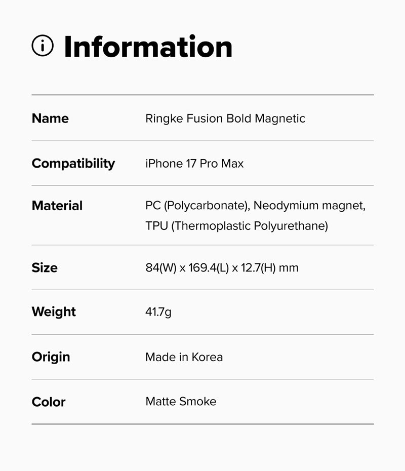 Fusion Bold Magnetic là mẫu thiết kế mới dành cho iPhone 17 Series có hỗ trợ sạc MagSafe với nâng cấp cạnh viền nhám giúp cầm chắc tay, có màu đen giúp tránh trường hợp bị ngả màu sau một thời gian sử dụng. Mặt lưng ốp có màu xám khói, mờ nhẹ giúp chống bám vân tay. Ngoài ra, thiết kế này đem lại cảm giác độc đáo cho iPhone của bạn trong khi vẫn giữ được các ưu điểm mỏng, nhẹ, chống sốc tốt của dòng Fusion truyền thống.