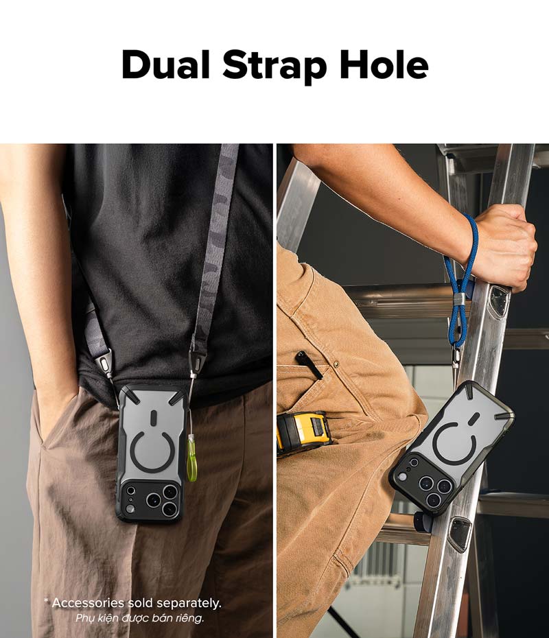 - Kích thước lỗ xỏ dây đeo cải tiến cho phép treo (móc) được 2 phụ kiện cùng lúc. Ngoài ra, dòng Fusion X được thiết kế thêm một lỗ xỏ dây đeo phía trên cùng giúp bạn có thể móc thêm phụ kiện yêu thích. Lưu ý: dây đeo được bán riêng. Hình ảnh chỉ minh họa cách sử dụng sản phẩm.
