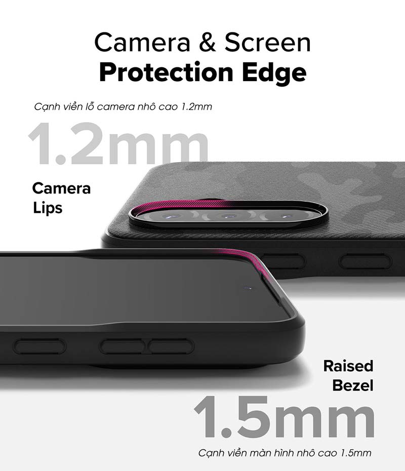 - Thiết kế cạnh viền lỗ camera nhô cao 1.2 mm và thiết kế cạnh viền màn hình nhô cao 1.5 mm giúp chống trầy.