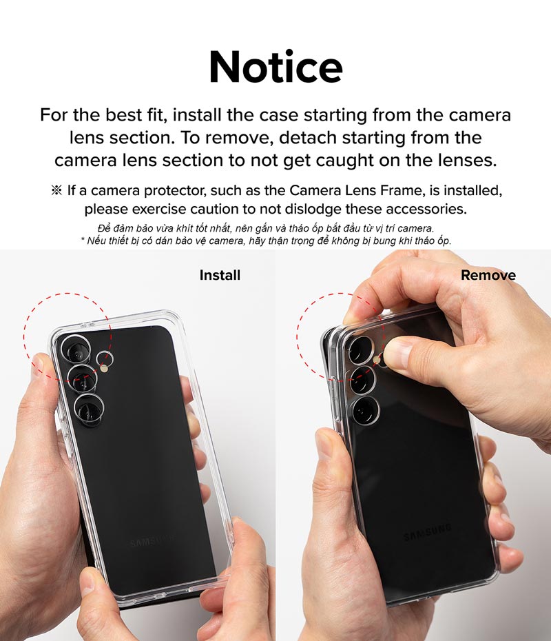- Để đảm bảo vừa khít tốt nhất, nên gắn và tháo ốp lưng bắt đầu từ vị trí camera. Nếu thiết bị có dán bảo vệ camera như dán Ringke Lens Frame Glass, hãy thận trọng để không bị bung dán camera khi tháo ốp.