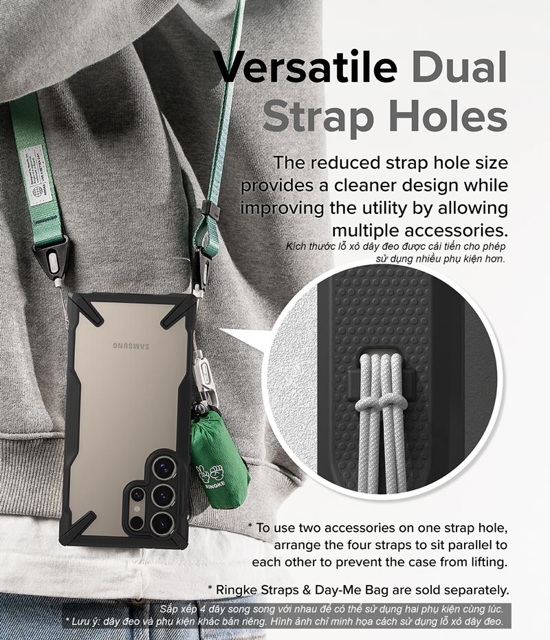 - Kích thước lỗ xỏ dây đeo cải tiến cho phép treo (móc) được 2 phụ kiện cùng lúc. Lưu ý: dây đeo được bán riêng. Hình ảnh chỉ minh họa cách sử dụng sản phẩm.