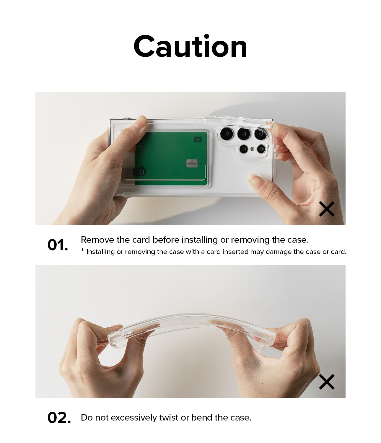 - Nên tháo thẻ card ra khỏi ốp trước khi lắp ốp vào thiết bị. KHÔNG bẻ cong ốp, có thể làm hư hại sản phẩm