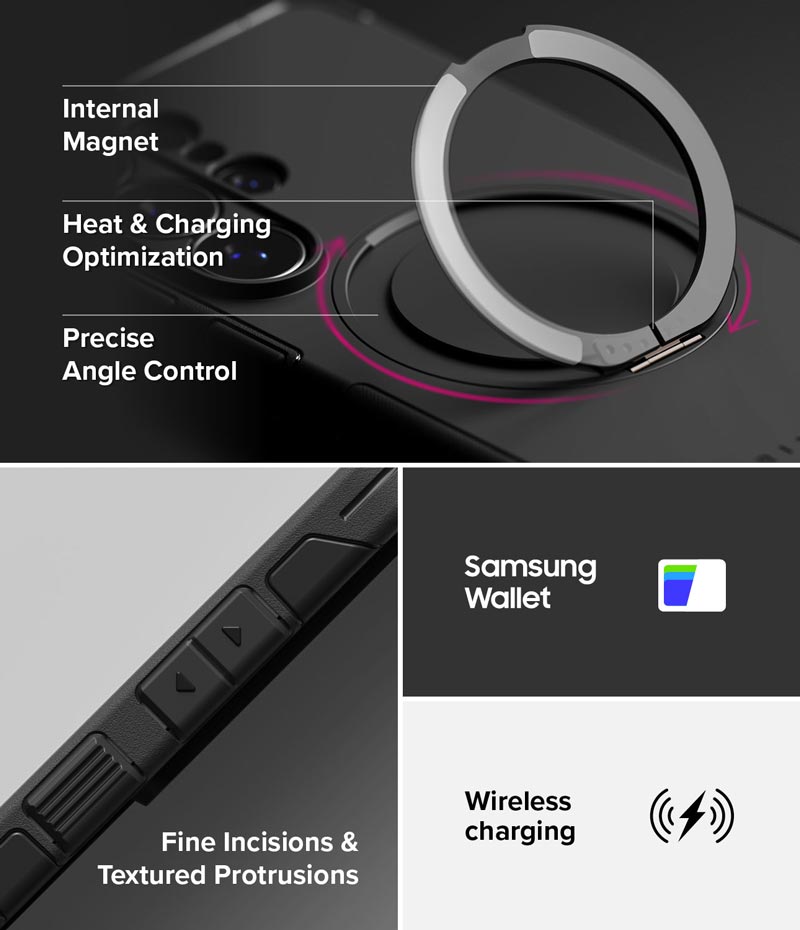 - Ốp Ringke Alles được thiết kế tích hợp cùng lúc nhiều tính năng hữu dụng: có lỗ xỏ dây đeo, hỗ trợ sạc MagSafe. có chân dựng kickstand và có vòng xỏ ngón tay trợ lực.