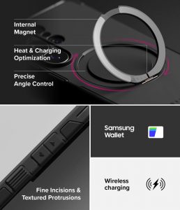 - Ốp Ringke Alles được thiết kế tích hợp cùng lúc nhiều tính năng hữu dụng: có lỗ xỏ dây đeo, hỗ trợ sạc MagSafe. có chân dựng kickstand và có vòng xỏ ngón tay trợ lực.