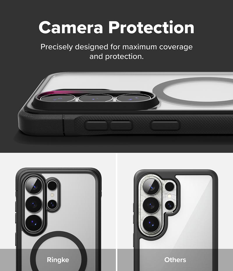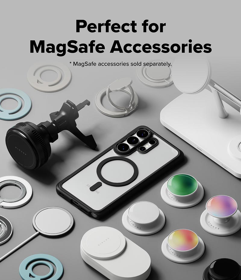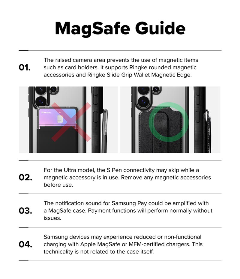 - Do thiết kế vùng camera được nâng cao khiến việc sử dụng các phụ kiện từ tính như ví đựng thẻ trở nên khó khăn, bị cấn và có thể che khuất một phần camera. Bạn nên chọn các phụ kiện từ tính có thiết kế góc bo tròn như ví từ tính Ringke Slide Grip Wallet Magnetic Edge. Với các loại phụ kiện từ tính khác, để chụp hình bạn chỉ cần tháo phụ kiện trước khi chụp ảnh và không ảnh hưởng đến tính năng của ốp lưng.