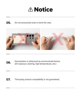 - Không bẻ cong ốp lưng hoặc vặn xoắn ốp vì có thể làm hư hại sản phẩm.