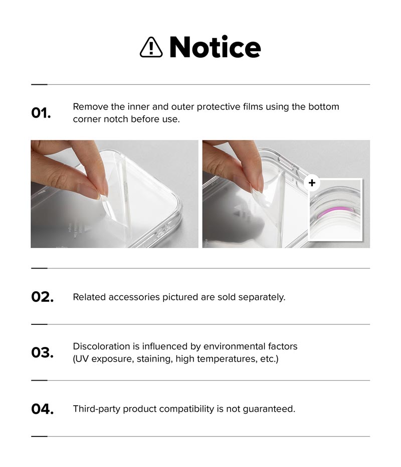 - Ốp lưng trong suốt có thể ngả màu do tác động bởi các yếu tố môi trường (tiếp xúc với tia cực tím, vết bẩn, nhiệt độ cao…)