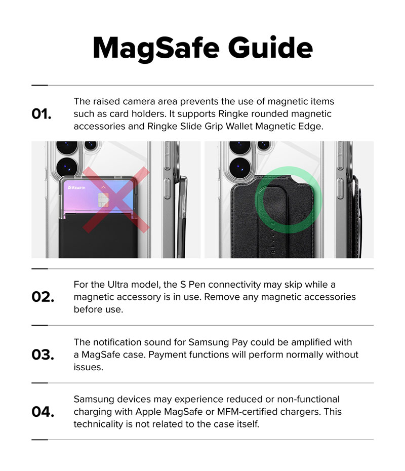 - Do thiết kế vùng camera được nâng cao khiến việc sử dụng các phụ kiện từ tính như ví đựng thẻ trở nên khó khăn, bị cấn và có thể che khuất một phần camera. Bạn nên chọn các phụ kiện từ tính có thiết kế góc bo tròn như ví từ tính Ringke Slide Grip Wallet Magnetic Edge. Với các loại phụ kiện từ tính khác, để chụp hình bạn chỉ cần tháo phụ kiện trước khi chụp ảnh và không ảnh hưởng đến tính năng của ốp lưng.