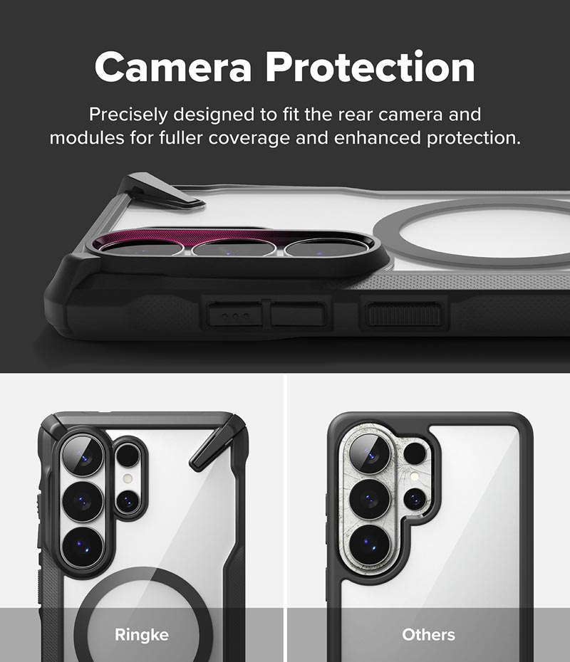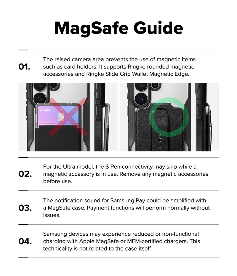 - Do thiết kế vùng camera được nâng cao khiến việc sử dụng các phụ kiện từ tính như ví đựng thẻ trở nên khó khăn, bị cấn và có thể che khuất một phần camera. Bạn nên chọn các phụ kiện từ tính có thiết kế góc bo tròn như ví từ tính Ringke Slide Grip Wallet Magnetic Edge. Với các loại phụ kiện từ tính khác, để chụp hình bạn chỉ cần tháo phụ kiện trước khi chụp ảnh và không ảnh hưởng đến tính năng của ốp lưng.