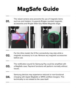 - Các thiết bị Samsung có thể gặp phải tình trạng sạc chậm hoặc không hoạt động khi sử dụng bộ sạc được chứng nhận Apple MagSafe hoặc MFM. Vấn đề kỹ thuật này không liên quan đến ốp lưng.
