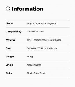 - Dòng Onyx α Magnetic là thiết kế mới nhất của Ringke dành cho Galaxy S26 Ultra năm nay