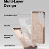- Do thiết kế vùng camera được nâng cao khiến việc sử dụng các phụ kiện từ tính như ví đựng thẻ trở nên khó khăn, bị cấn và có thể che khuất một phần camera. Bạn nên chọn các phụ kiện từ tính có thiết kế góc bo tròn như ví từ tính Ringke Slide Grip Wallet Magnetic Edge. Với các loại phụ kiện từ tính khác, để chụp hình bạn chỉ cần tháo phụ kiện trước khi chụp ảnh và không ảnh hưởng đến tính năng của ốp lưng.