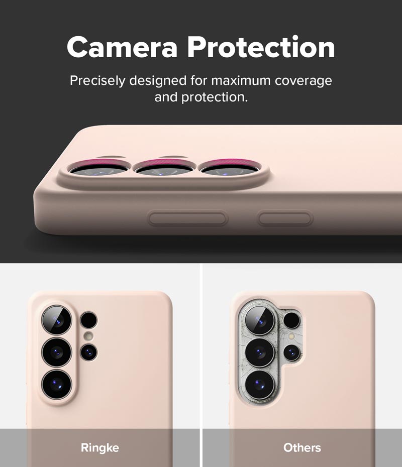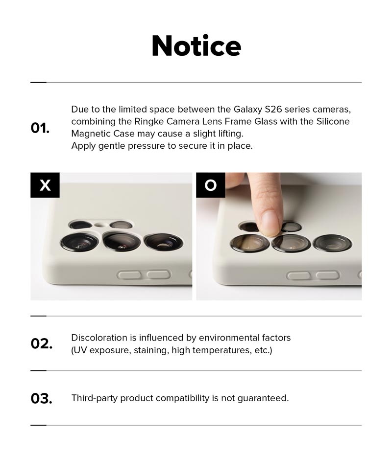 - Do khoảng cách giữa các lỗ camera của Galaxy S26 Ultra khá nhỏ nên khi tháo/lắp ốp lưng có thể làm bong nhẹ dán bảo vệ camera Ringke Lens Frame Glass, bạn có thể dùng lực nhẹ cố định dán camera vào đúng vị trí.