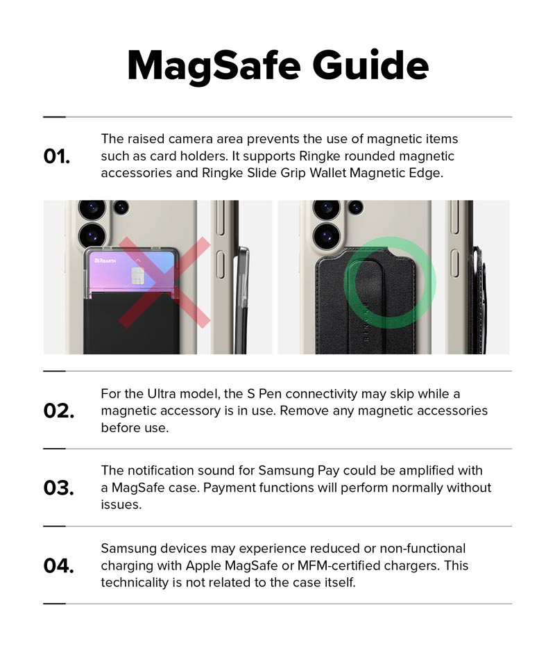 - Các thiết bị Samsung có thể gặp phải tình trạng sạc chậm hoặc không hoạt động khi sử dụng bộ sạc được chứng nhận Apple MagSafe hoặc MFM. Vấn đề kỹ thuật này không liên quan đến ốp lưng.