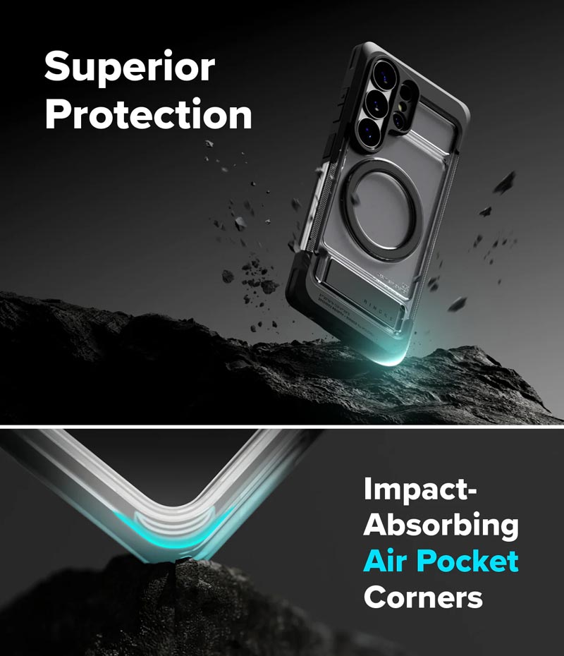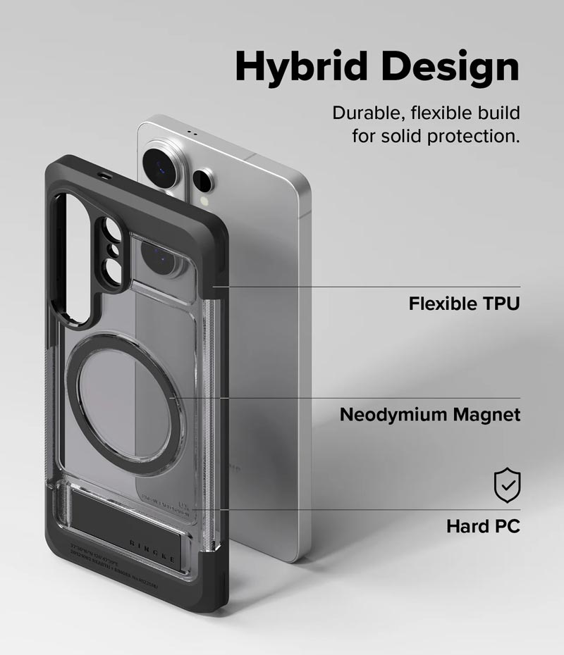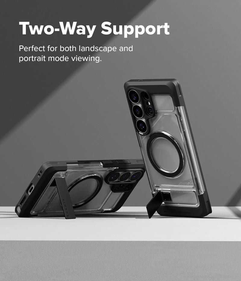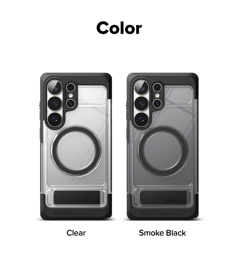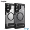 - Ốp Ringke UX Magnetic là thiết kế hoàn toàn mới và tích hợp 2 tính năng hữu dụng: vừa có chân dựng điện thoại, vừa hỗ trợ sạc MagSafe.