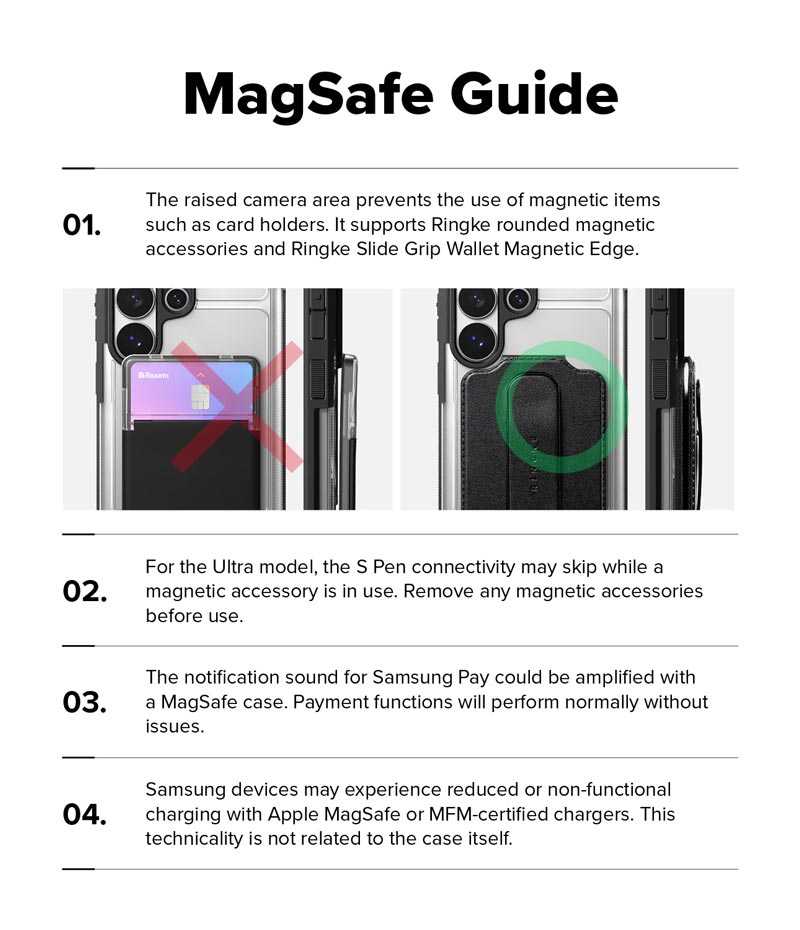 - Do thiết kế vùng camera được nâng cao khiến việc sử dụng các phụ kiện từ tính như ví đựng thẻ trở nên khó khăn, bị cấn và có thể che khuất một phần camera. Bạn nên chọn các phụ kiện từ tính có thiết kế góc bo tròn như ví từ tính Ringke Slide Grip Wallet Magnetic Edge. Với các loại phụ kiện từ tính khác, để chụp hình bạn chỉ cần tháo phụ kiện trước khi chụp ảnh và không ảnh hưởng đến tính năng của ốp lưng.