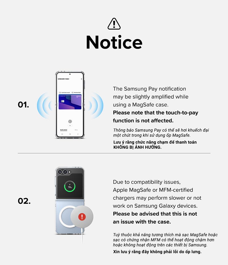 - Thông báo Samsung Pay có thể sẽ hơi khuếch đại một chút trong khi sử dụng ốp. Lưu ý: chức năng chạm-để-thanh-toán KHÔNG BỊ ẢNH HƯỞNG.