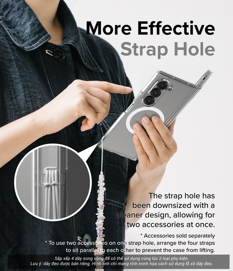 - Kích thước lỗ xỏ dây đeo cải tiến cho phép treo (móc) được 2 phụ kiện cùng lúc. Lưu ý: dây đeo được bán riêng. Hình ảnh chỉ minh họa cách sử dụng sản phẩm.