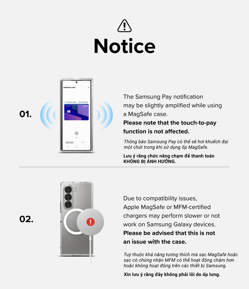 - Thông báo Samsung Pay có thể sẽ hơi khuếch đại một chút trong khi sử dụng ốp. Lưu ý: chức năng chạm-để-thanh-toán KHÔNG BỊ ẢNH HƯỞNG.