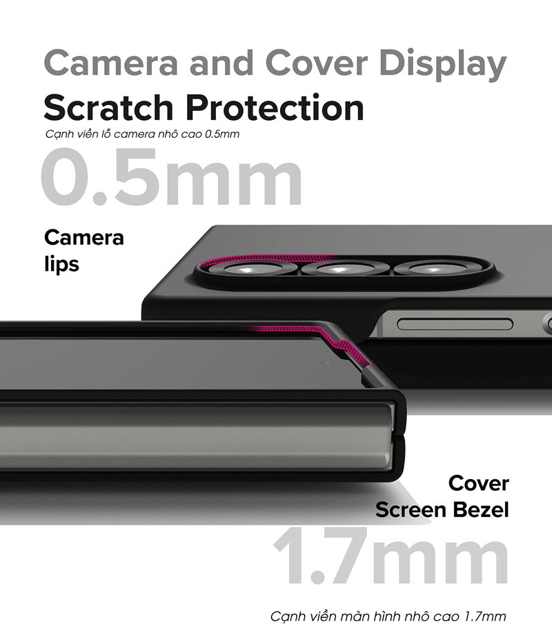 - Thiết kế cạnh viền lỗ camera nhô cao 0.5 mm và viền cạnh màn hình nhô cao 1.7 mm giúp chống trầy xước khi đặt trên mặt phẳng