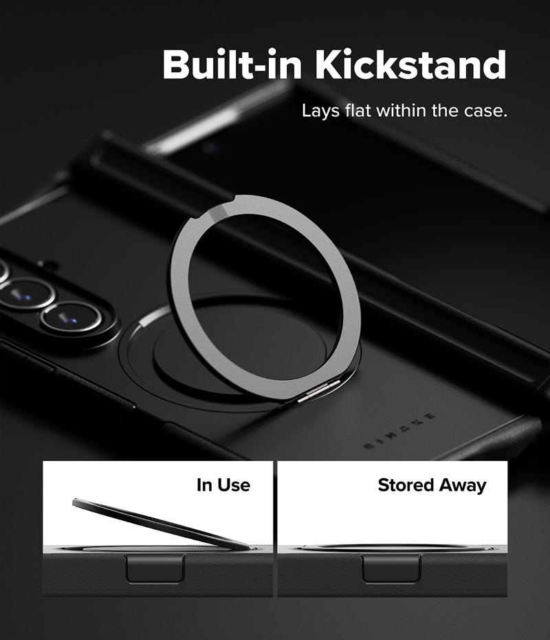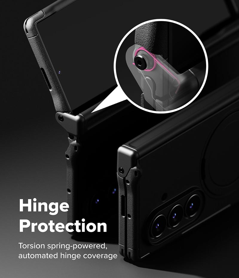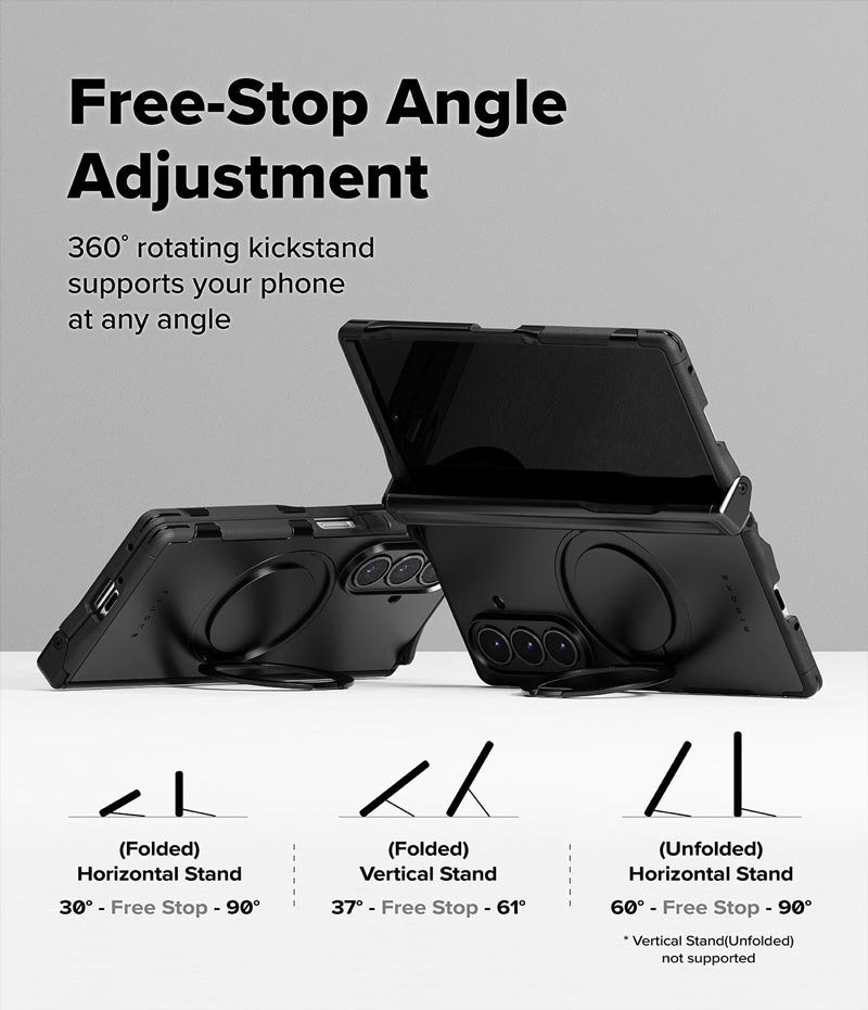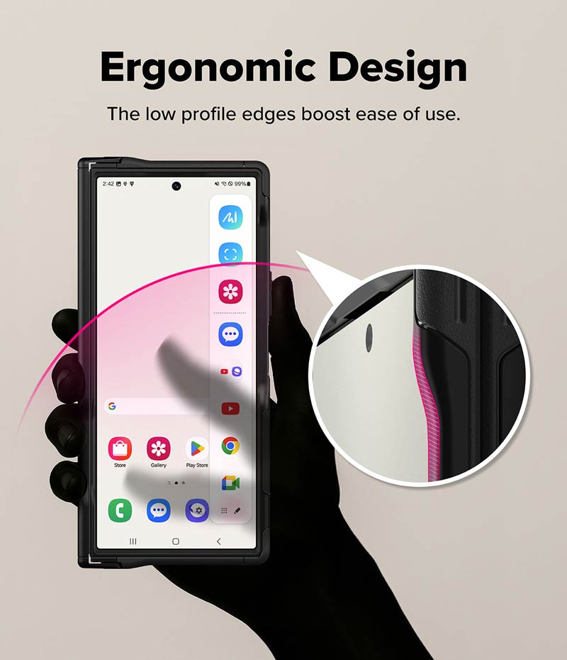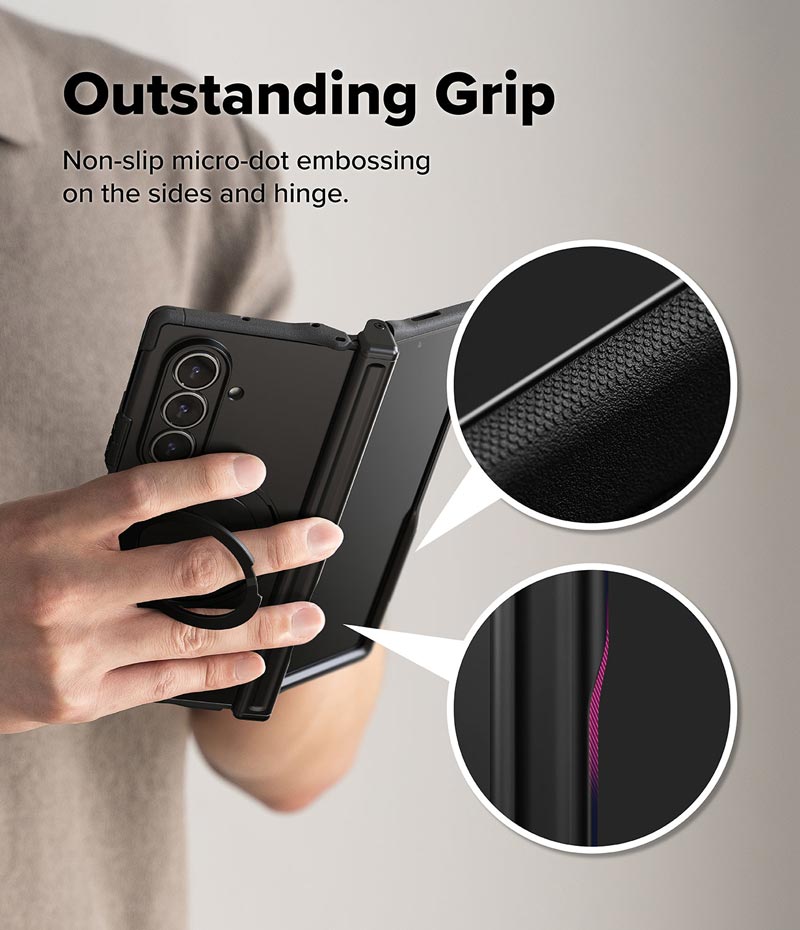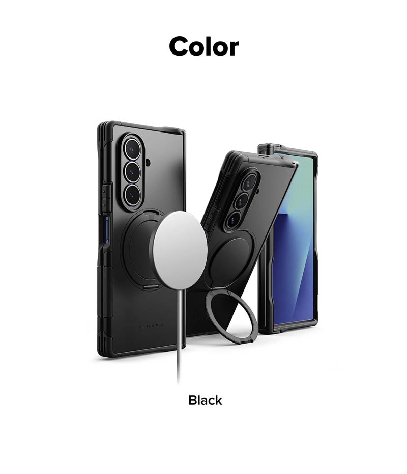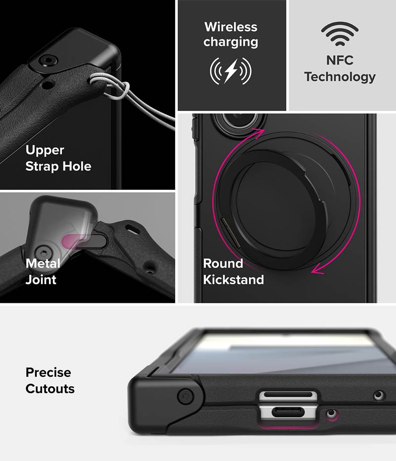 - Ốp Ringke Alles được thiết kế tích hợp cùng lúc nhiều tính năng hữu dụng: có phần bảo vệ bản lề Fold 7, có lỗ xỏ dây đeo, hỗ trợ sạc MagSafe. có chân dựng kickstand và có vòng xỏ ngón tay trợ lực.