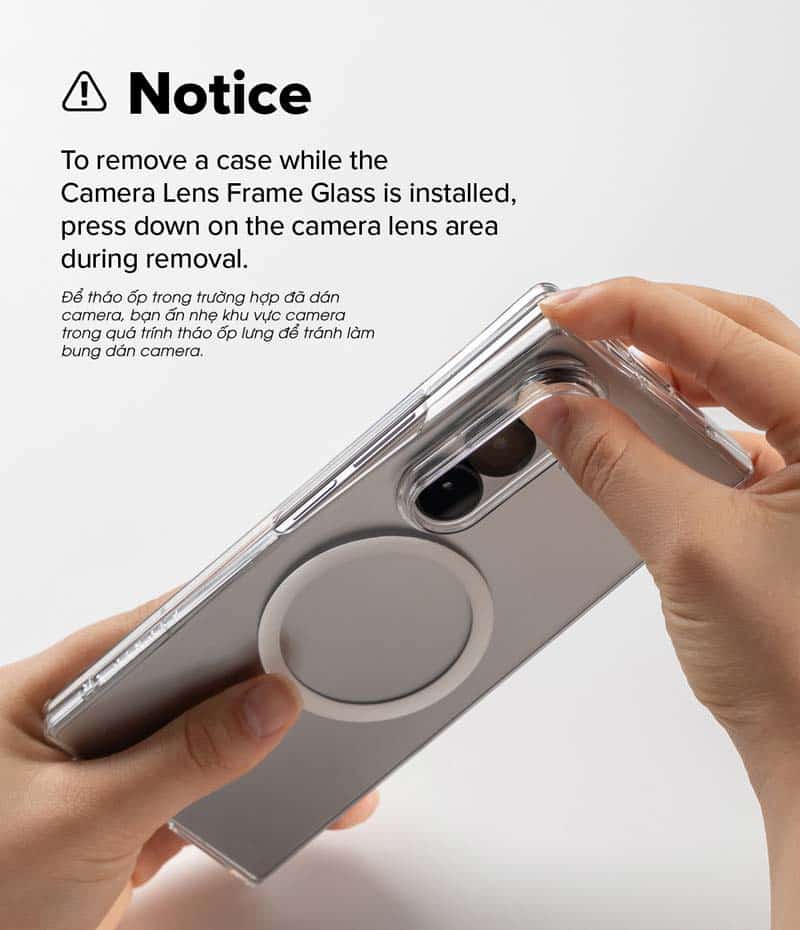 - Để tháo ốp trong trường hợp thiết bi đã dán bảo vệ camera, bạn ấn nhẹ vào vị trí camera để tránh bị bong lớp dán camera trong quá trình tháo ốp lưng.