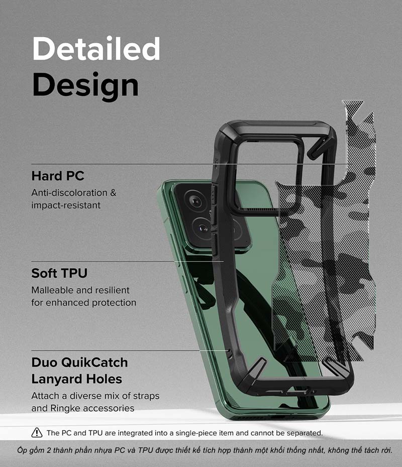 - Ốp được thiết kế 2 thành phần: mặt lưng nhựa cứng Polycarbonate và viền nhựa dẻo TPU giúp dễ dàng tháo lắp ốp