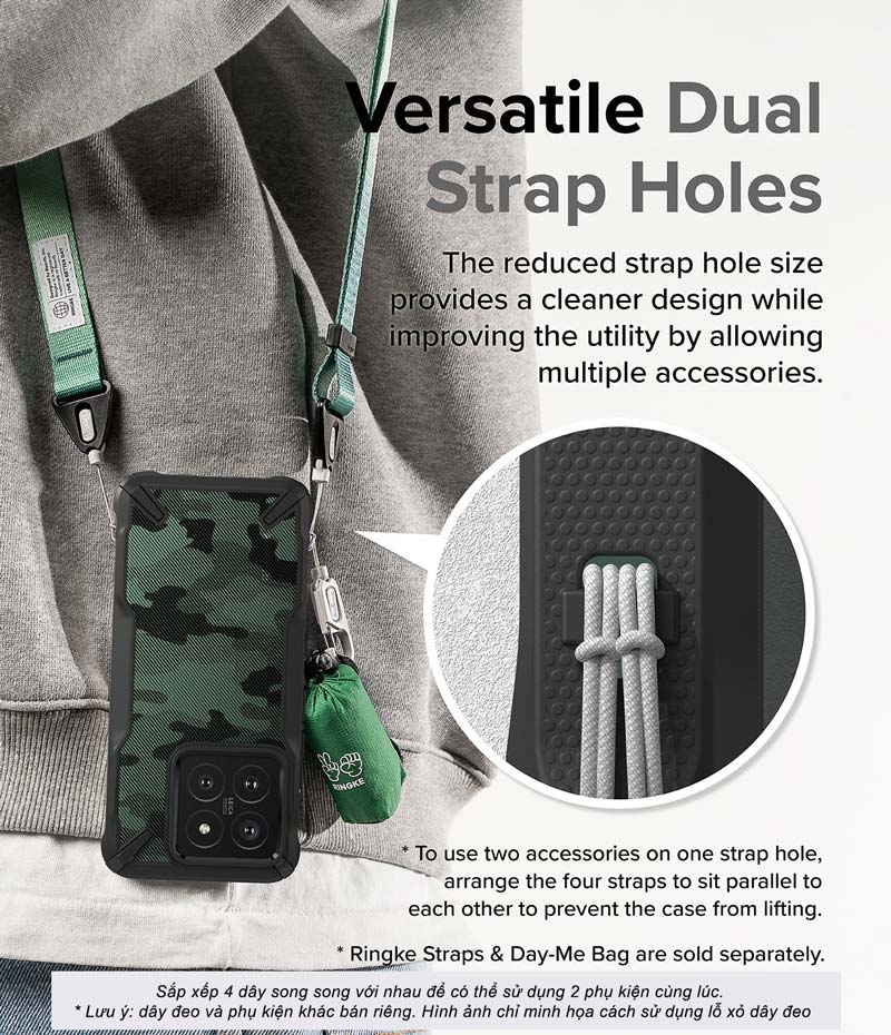 - Kích thước lỗ xỏ dây đeo cải tiến cho phép treo (móc) được 2 phụ kiện cùng lúc. Lưu ý: dây đeo được bán riêng. Hình ảnh chỉ minh họa cách sử dụng sản phẩm.