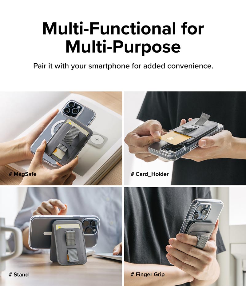 - Tích hợp 2 tính năng trong một: ví đựng thẻ và giá đỡ MagSafe có thể điều chỉnh góc độ nghiêng