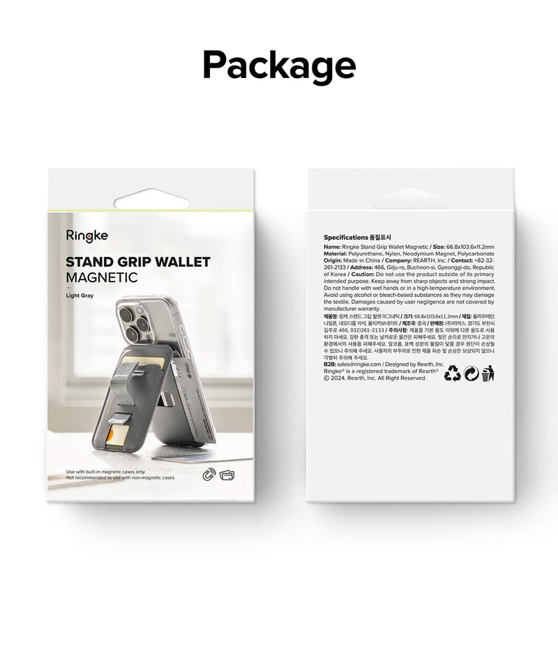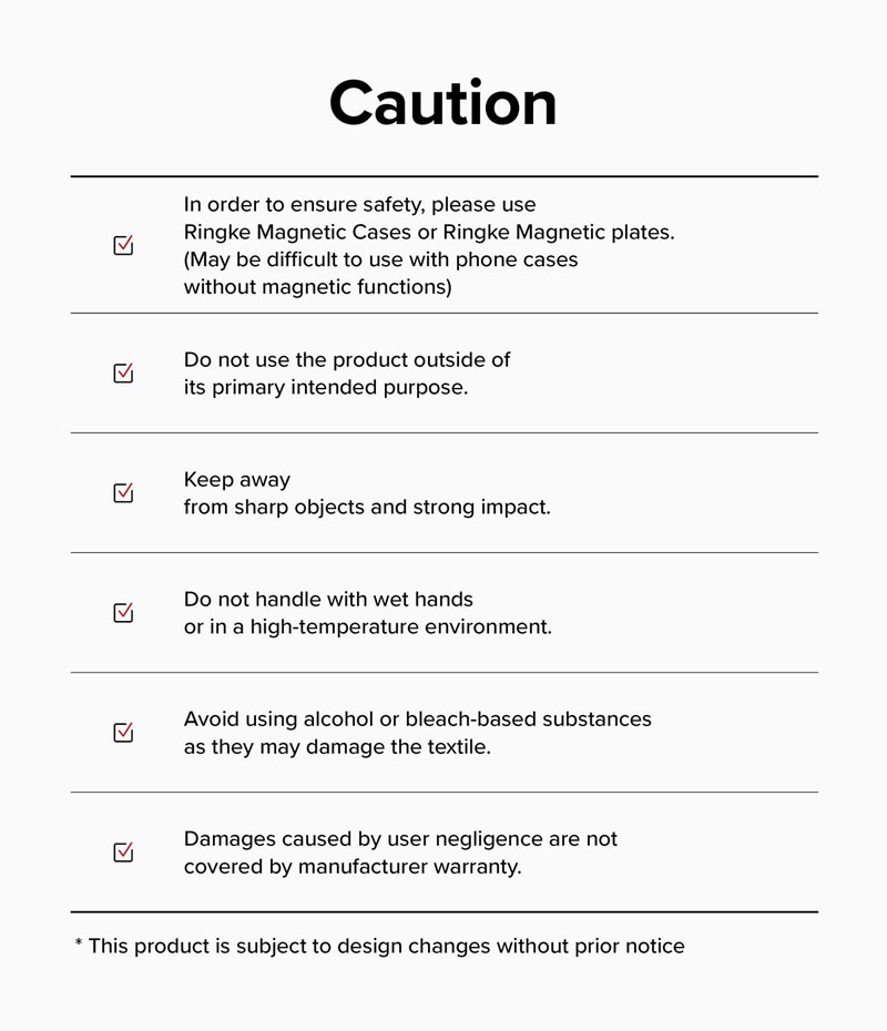 - Nên sử dụng sản phẩm này với ốp lưng MagSafe hoặc ốp lưng thông thường nhưng có dán vòng từ tính Magnetic. Khuyến khích sử dụng ốp lưng từ tính Ringke Magnetic hoặc vòng từ tính Ringke Magnetic Plate để tương thích tốt hơn.