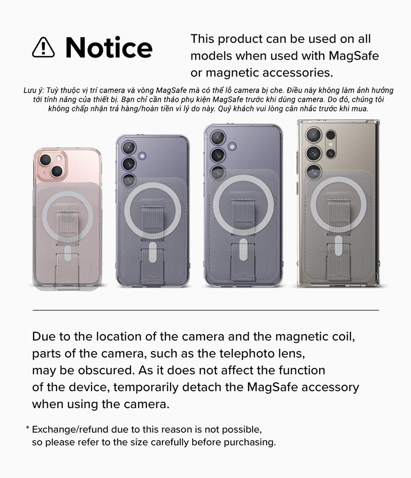 - Tuỳ thuộc vào vị trí lỗ camera của thiết bị và vòng MagSafe mà sản phẩm có thể che lỗ camera. Điều này không làm ảnh hưởng đến tính năng của thiết bị, bạn chỉ cần tháo phụ kiện MagSafe trước khi dùng camera. Do đó, chúng tôi không chấp nhận trả hàng/hoàn tiền vì lý do này. Quý khách vui lòng cân nhắc trước khi mua.