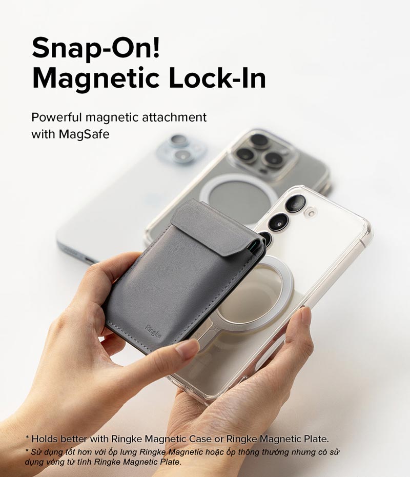 - Nên sử dụng sản phẩm này với ốp lưng MagSafe hoặc ốp lưng thông thường nhưng có dán vòng từ tính Magnetic. Khuyến khích sử dụng ốp lưng từ tính Ringke Magnetic hoặc vòng từ tính Ringke Magnetic Plate để tương thích tốt hơn.